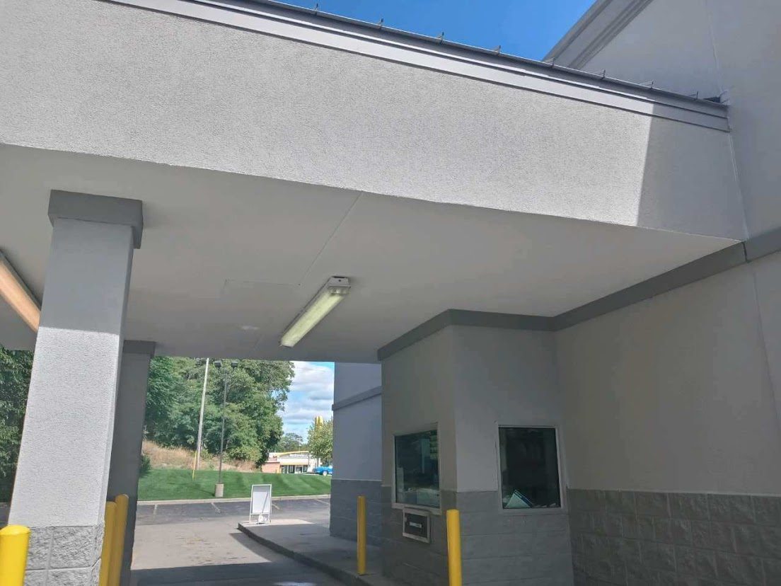This project took place during COVID testing that was being run out of the pharmacy. The drive through needed to stay open during the project. Traffic management was required to make sure that COVID testing operations were not interrupted during the painting and repair project.